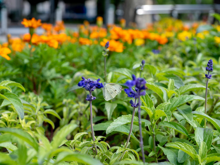 街角の植え込みにも色とりどりの花が咲いています。