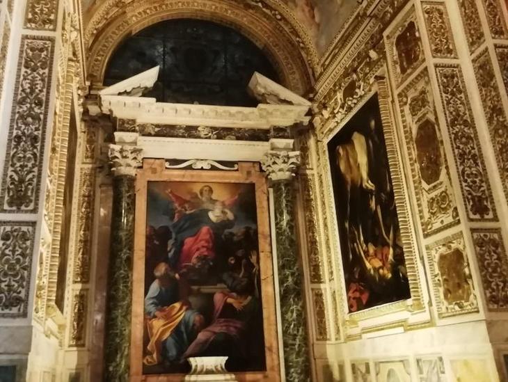 中央祭壇の左側にあるチェラージ礼拝堂(伊語:Cappella Cerasi)には、ルネッサンス期の後のバロック期に登場したカラヴァッジョ(伊語:Caravaggio)というイタリア人画家が手がけた作品が左右側面に飾られており、光と陰の明暗を明確に分けた表現が見事というべき素晴らしい油彩画があります。作品名は、右の側面が「聖パオロの改宗(伊語:Conversione di San Paolo)」となり、左の側面には「聖ペテロの磔刑(伊語:Crocefissione di San Pietro)」が飾られています。この祭壇の中央に飾られているのが、カラヴァッジョと並ぶもう一人の巨匠のアンニーバレ・カラッチ(伊語:Annibale Carracci)の聖母被昇天(伊語:Assunzione della Vergine)でこの作品もまた、魅力があります。