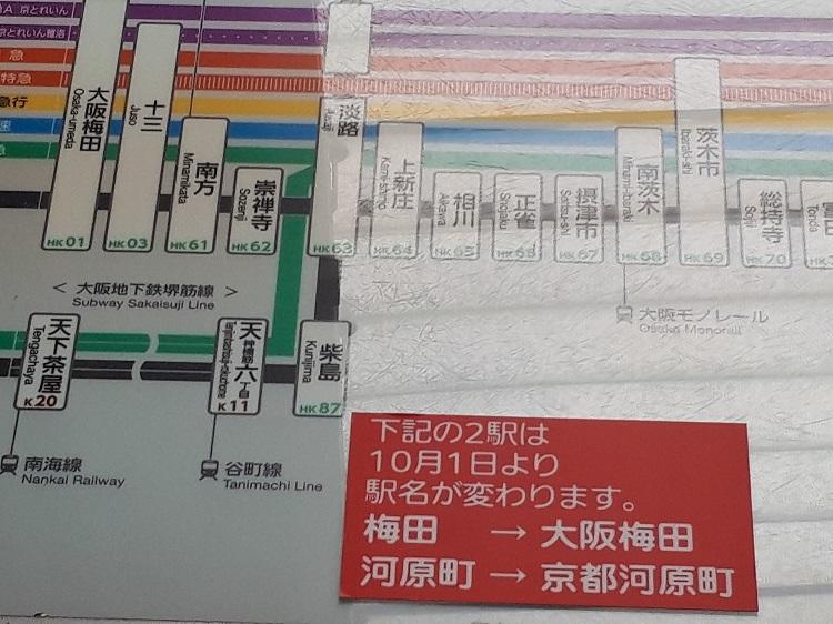 外国人観光客の利用が増える中、梅田が大阪市の中心地にある駅だとわかりやすくする狙いだそうです。JRは「大阪」駅なのですが、私鉄と大阪メトロ(かつての大阪市営地下鉄)は「梅田」という名前を使っています。住所が大阪市北区梅田なのでこのような駅名なのですが、同じ場所に大阪駅と梅田駅が混在しています。確かに筆者も大阪に住み始めてまもない頃は「梅田駅ってどこ? 大阪駅じゃないの!?」と焦った記憶があります。大阪人は大阪駅周辺に行くときには「大阪駅に行く。」とは言わずに「梅田に行く。」と言いますし、百貨店も全て店舗名を梅田店としています。周辺には大阪メトロ御堂筋線の梅田駅、谷町線の東梅田駅、四つ橋線の西梅田駅があり、この駅名も更に複雑にさせています。仮称ではありますが、2023年春には北梅田という駅もできる予定で、ますますややこしくなりそうです。大阪ではありませんが、京都市にある阪急電鉄「河原町」駅も「京都河原町」駅に変更になりました。写真は変更前の9月の案内板です。