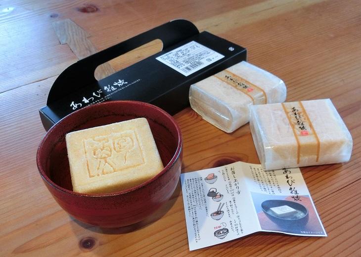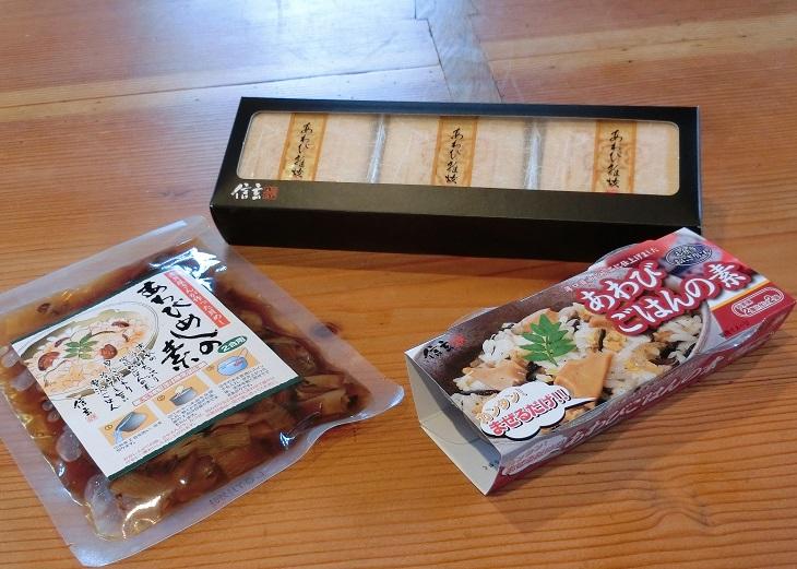 奥から「あわび雑炊最中」3個入り(税込み1,080円)、左「あわびめしの素」(税込み435円)、右「あわびごはんの素」(税込み380円)です。