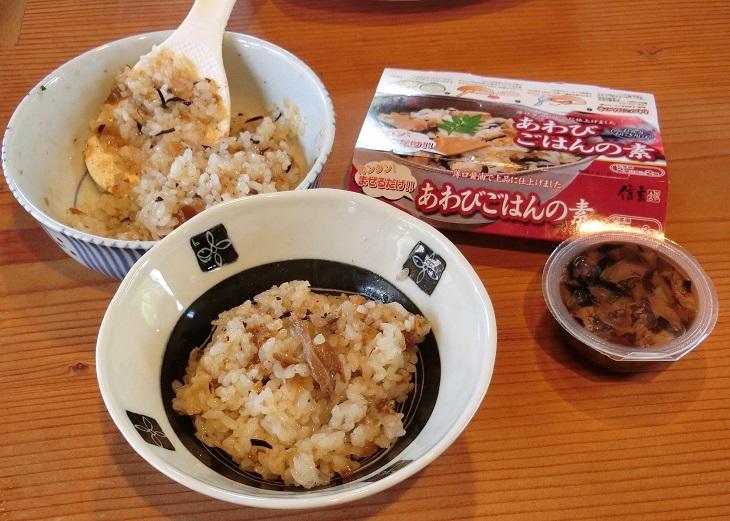 「あわびめしの素」は、炊き込みご飯の素です。2合分のお米とぎ、炊飯器に入れてスイッチポンで炊き上がります。歯ごたえばっちりのあわび。そしてあわびの旨みをたっぷり吸いこんだご飯がまた、うまい!