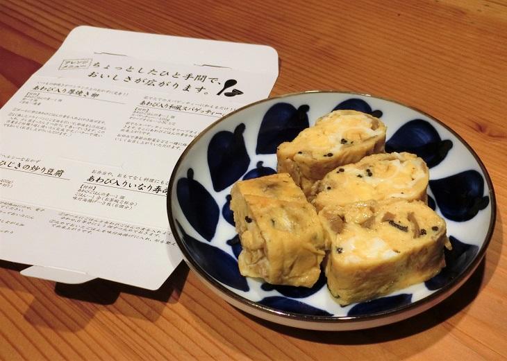 アレンジメニューのヒントが裏にあったので、「あわび入り厚焼き卵」を焼いてみました。1カップ卵4個分を胡麻油で焼きました。お酒の肴にいい感じの味わいです。