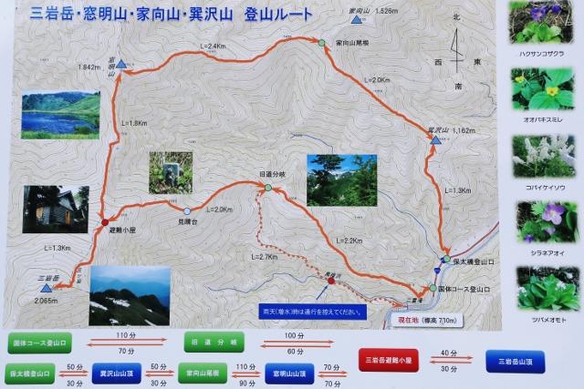 今回は、国体コースを登って三岩岳と窓明山を巡り、保太橋登山口へと周回します。