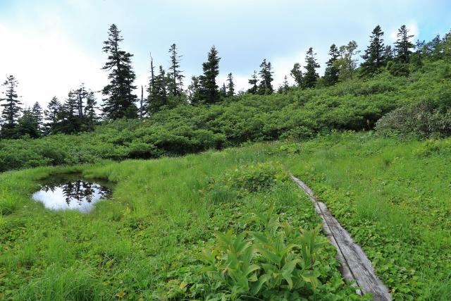 オオシラビソ群生地周辺から小さな湿原が複数見られるようになります。
