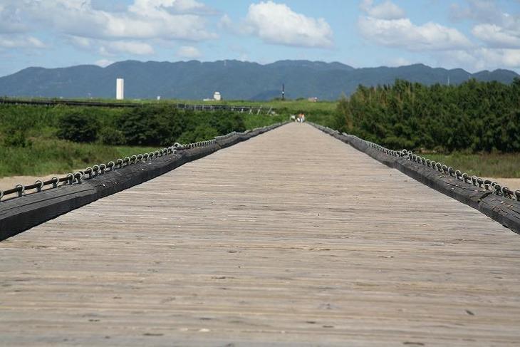 流れ橋は、木津川に架かる全長356.5m。幅3.3メートルの日本最長級の木橋です。