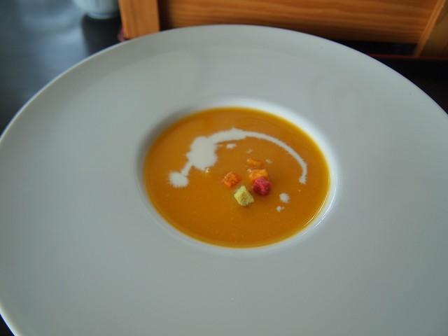 創作ランチのスープは、パンプキンのポタージュで、クルトンではなく、材料の一部を