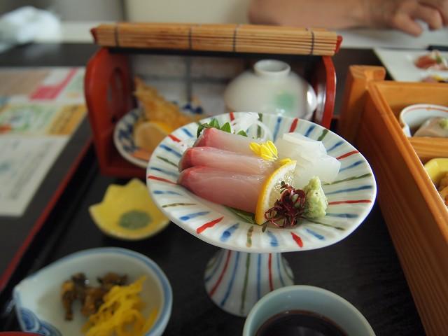 ハマチとイカのお造りに、奥は天ぷらと蒸し物。
