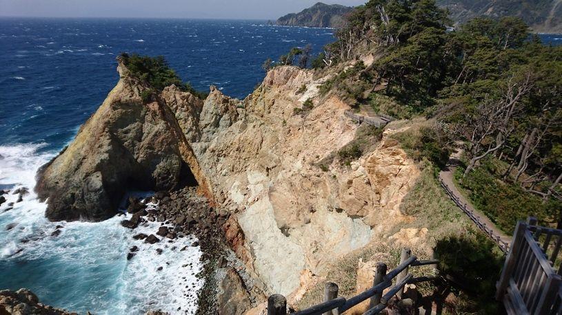 夕日を受けると黄褐色の岩肌が金色に輝くことからその名がついたといわれている黄金崎。