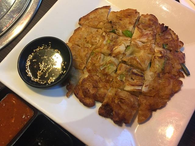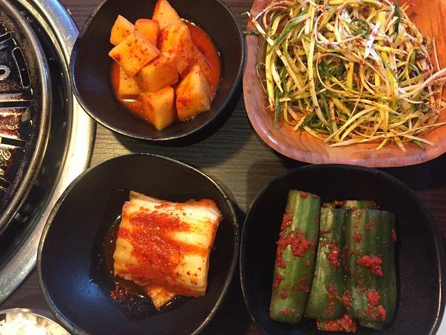 注文が済むと、まず最初にキムチ各種や薬味野菜、ネギとイカのチヂミが出てきます。どれも本格的なコリアンの味で、とても美味!