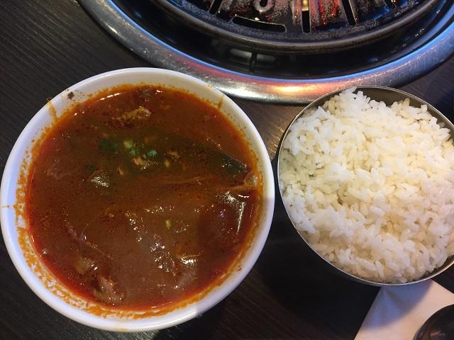スープは濃厚スパイシー・ビーフ・スープか、あっさり系わかめスープからの2択。私はスパイシー・ビーフを、連れはわかめスープにしました。でも要注意!うっかりチヂミとスープを最初に完食しちゃうと、お腹を満たしてしまい肝心の焼肉が大変です。笑 とても美味しいけどペース配分も気を付けないと・・・。