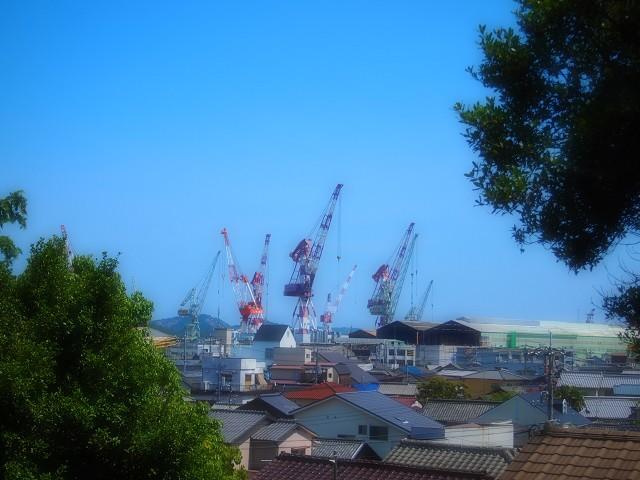 末社の臥龍稲荷神社奥宮へ登っていくと海が見え、昔の入江の様子と造船で栄えていることがよくわかります。
