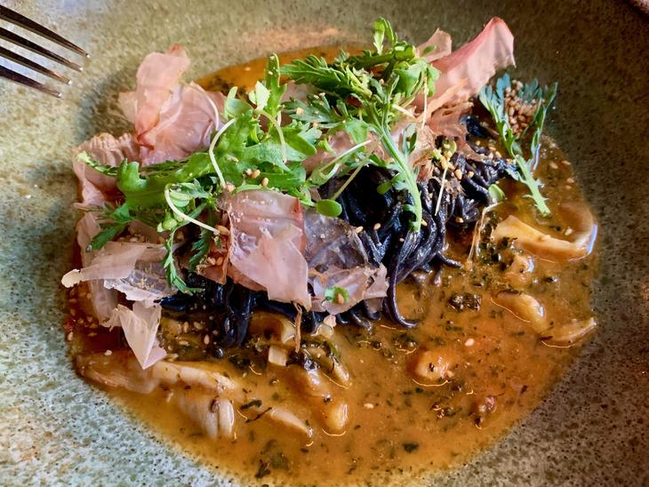 『イカスミのヌードル(Squid Ink Noodle)$18』 は、出汁(Dashi)が程よく効いていてごま油の香りが"イカスミ"を短な物に変えてくれてる。 とても食べやすい。 美味しい。