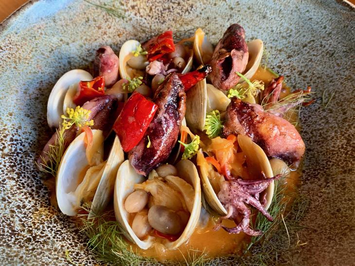 『イカとクラム(Grilled Monterey Baby Squid & Clams )$26』 イカで被ってしまったみたいだけど、これは頼んで正解! イカと旬のクランベリービーンズ(サヤがクランベリー色で加熱するととても柔かくなる、豆独特の匂いがな人でも食べやすいお豆さん)はよく会う食材として使われるが、これも見事☆