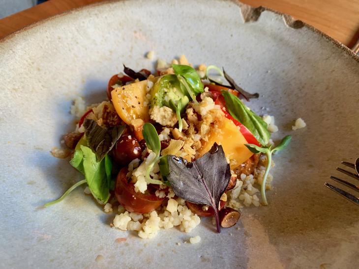 自社ファームで採れた『エアルームトマトのサラダ(Heirloom Tomatoes)$16』は、トマトが濃厚な甘さで果肉たっぷりアーモンドはアクセント。 室温で提供されているのは味がしっかり分かるためだ。