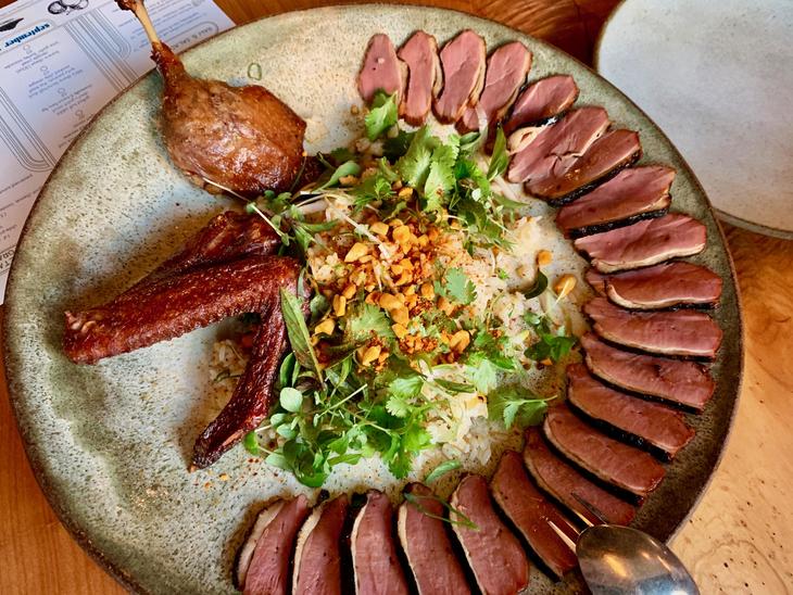 大皿料理ですよと言われた『鴨のバーベキュー(BBQ Half Duck)$65』 が、果たして3〜4人でシェアするべきボリューム。 しかし美味しすぎて二人で全部食べ切ってしまったのは、お店の人も少々驚いてた。 30分くらいかかるので先に頼んでおくのがいい。 チャイニーズの北京ダックを思わせる皮パリパリはやめられない止まらなかったのだ。