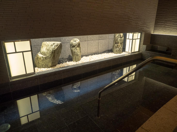 大浴場はくつろぎの”和”をコンセプトに、黒御影石を使用しているほか、行灯のようなやわらかな燈です。