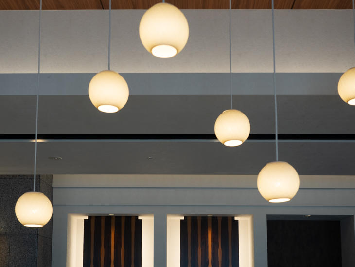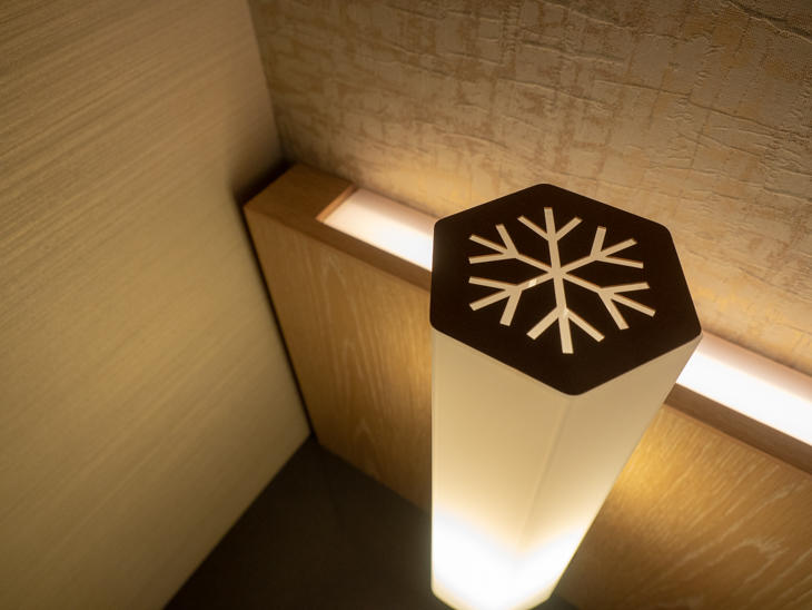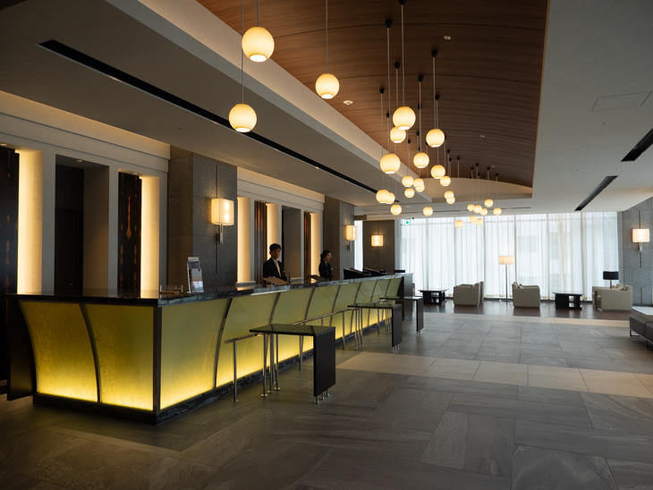 舞い降りる雪をイメージしたフロントのランプと、フロントデスク後方の自然と融合するような空間を象徴する天然木のはめ込み。