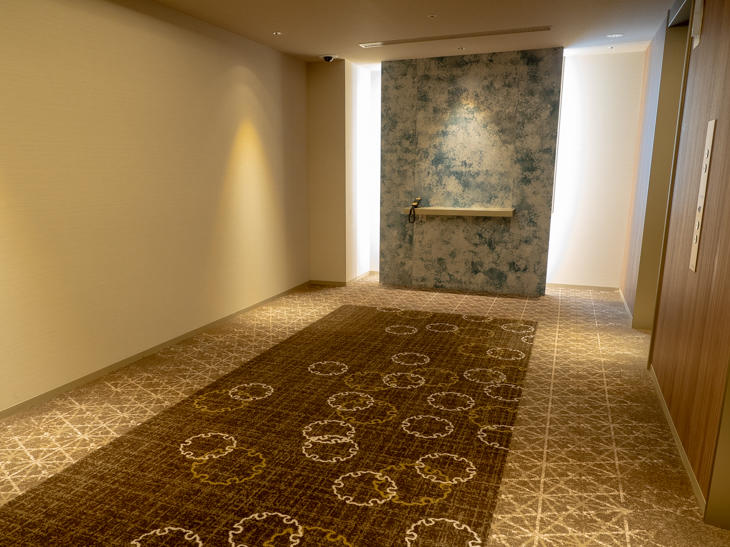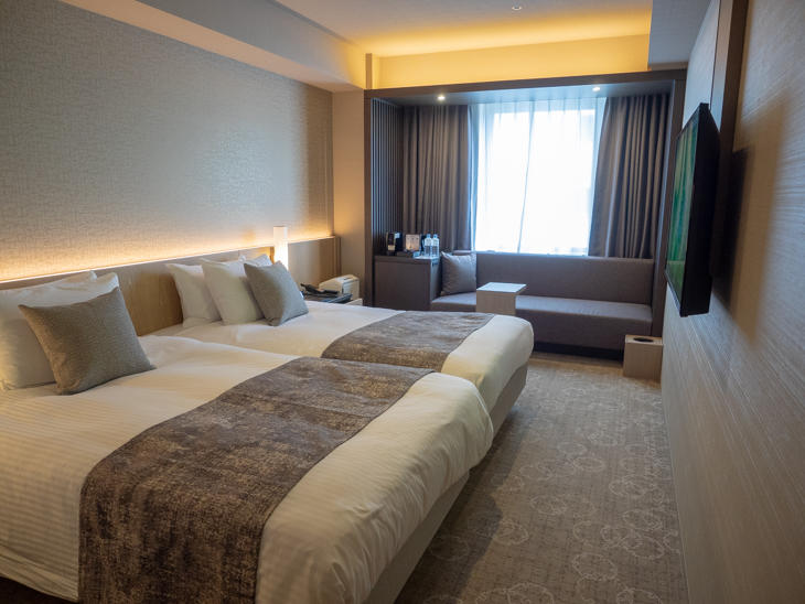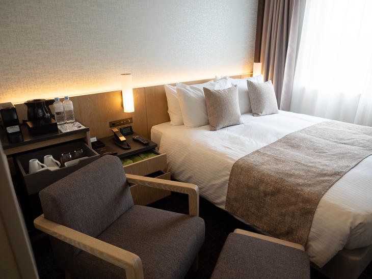 ホテル全館を通じて、北海道らしさを強調する雪のモチーフと、くつろぎの”和”を融合させた落ち着いた色を基調としたデザインで、客室の広さなどを含め、ススキノ界隈の喧騒とは対照的な雰囲気です。