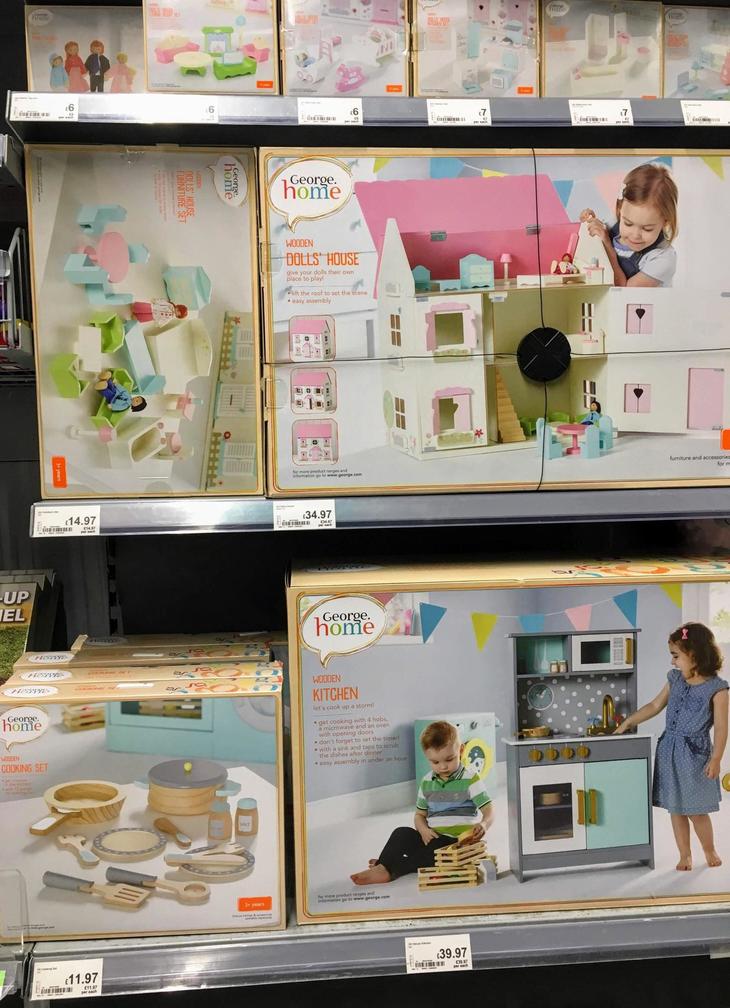 まずは右端に位置する衣類、ホーム雑貨コーナーをチェック。このレベルのスーパーにしては意外なくらいハイセンスなPB、ジョージ Georgeが結構イイんですよ。特筆すべきはオモチャ類。私はプラスチックがあまり好きではないのですが、お庭で遊べるアースカラーのブリキの小さなジョウロとバケツが各1ポンド(約133円)、他店ですとPBで木製はまず見掛けないのに、おままごとや人形セットまでが充実している事に驚きます。