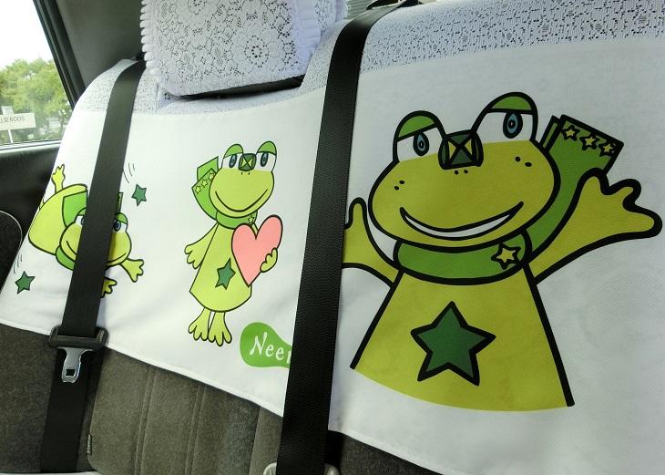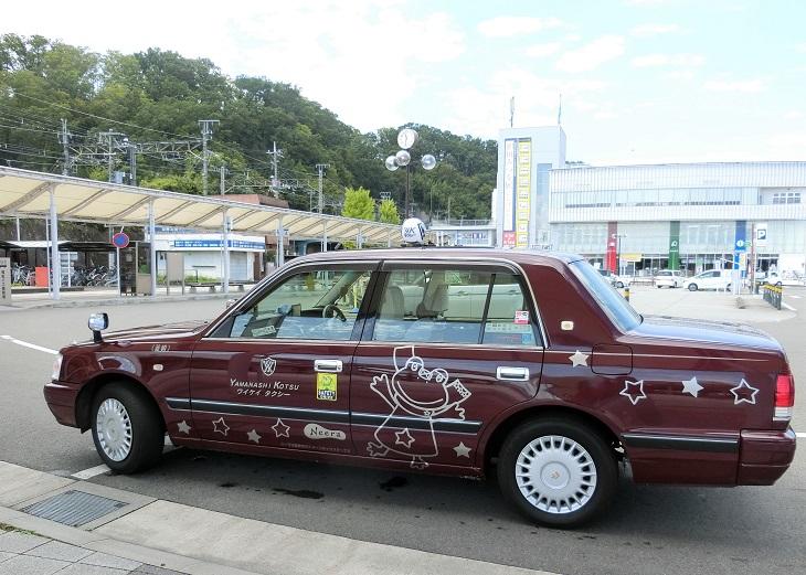 キャラクタータクシーですが、シックでお洒落ですね~♩ ワインの産地、山梨ならではのワインカラーです。