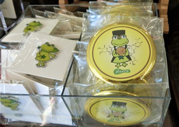 この缶バッジ(150円)のニーラ、ちょっと変わった格好をしていますよね。ここ韮崎市は、ノーベル賞を受賞した大村智博士の出身地なんです。だからニーラ、ノーベル賞を受賞したときの大村博士の姿をしているんです。
