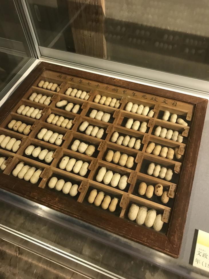 展示品には養蚕業の道具や繭がありました。
