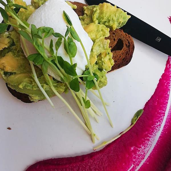 ↓ビーツソースから作られたローズ色のおソースがポイントのスマッシュ・アボカド↓