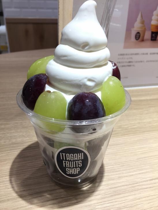 表面のぶどうは半分にカットされていて、シャインマスカットを一口食べて甘い!と思ったのですが、カップの中にはカットされていない丸ごとのぶどうがゴロゴロ。これを丸ごと齧ってみると、更に甘い~!!ソフトクリームに負けない甘さでした。