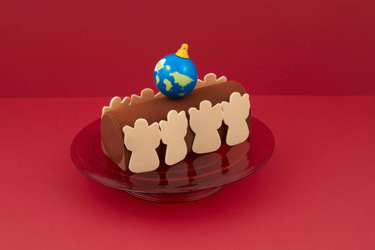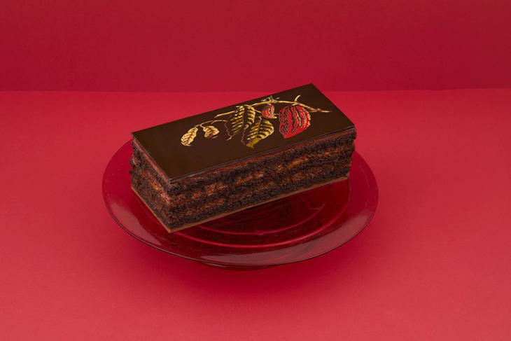 ジャン=ポール・エヴァンの「Hope(願い)」とユーモアを込めたケーキで、地球を守るために天使たちが踊っている様子が表現されています。花や木を思わせる香りが特徴のエクアドル産カカオのムースに、小麦粉不使用のビスキュイショコラ、クレームブリュレ、マロン風味のサブレを合わせています。