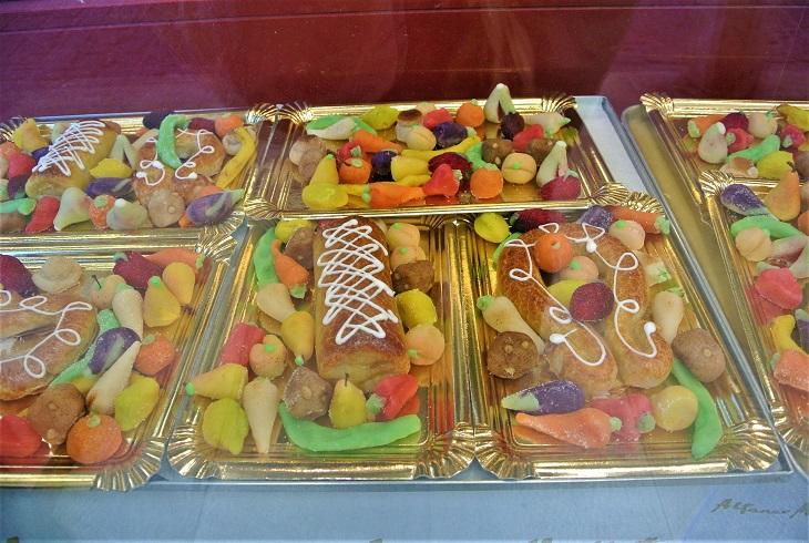 同時にこの日はバレンシア市と周辺の町では、バレンタインデー的な日でもあるのです。果物や野菜をかたどったカラフルなマジパン(アーモンド粉と砂糖の練り菓子)をスカーフに包み、男性が愛する女性にプレゼントします。10月になるとお菓子屋さんのウィンドーにおままごとセットのようなかわいいマジパンが並び、目を楽しませてくれます。