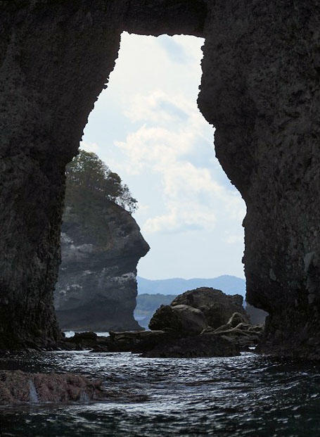 洞窟は奥行きが浅く、岩の中でU字型になっていて、出口近くがわずかに青みがかって見えます。