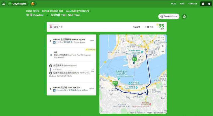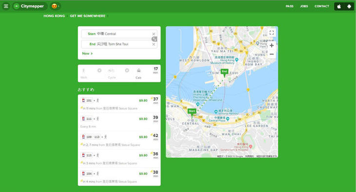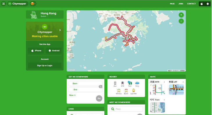 香港は2019年6月からデモが続いていることで、地下鉄の最終電車が22時など通常よりはやく閉鎖されるケースが出てきました。もし通常運行していたとしても、ついつい飲み過ぎて終電を逃した場合、交通機関をどうすればいいのか…というのがあります。今回紹介するのは、タクシー以外の公共交通機関を利用して帰路を示してくれるアプリ / ウェブサイトの「Citymapper」です。香港は24時間バスが運行されているからこそ実現できたアプリと言えるでしょう。