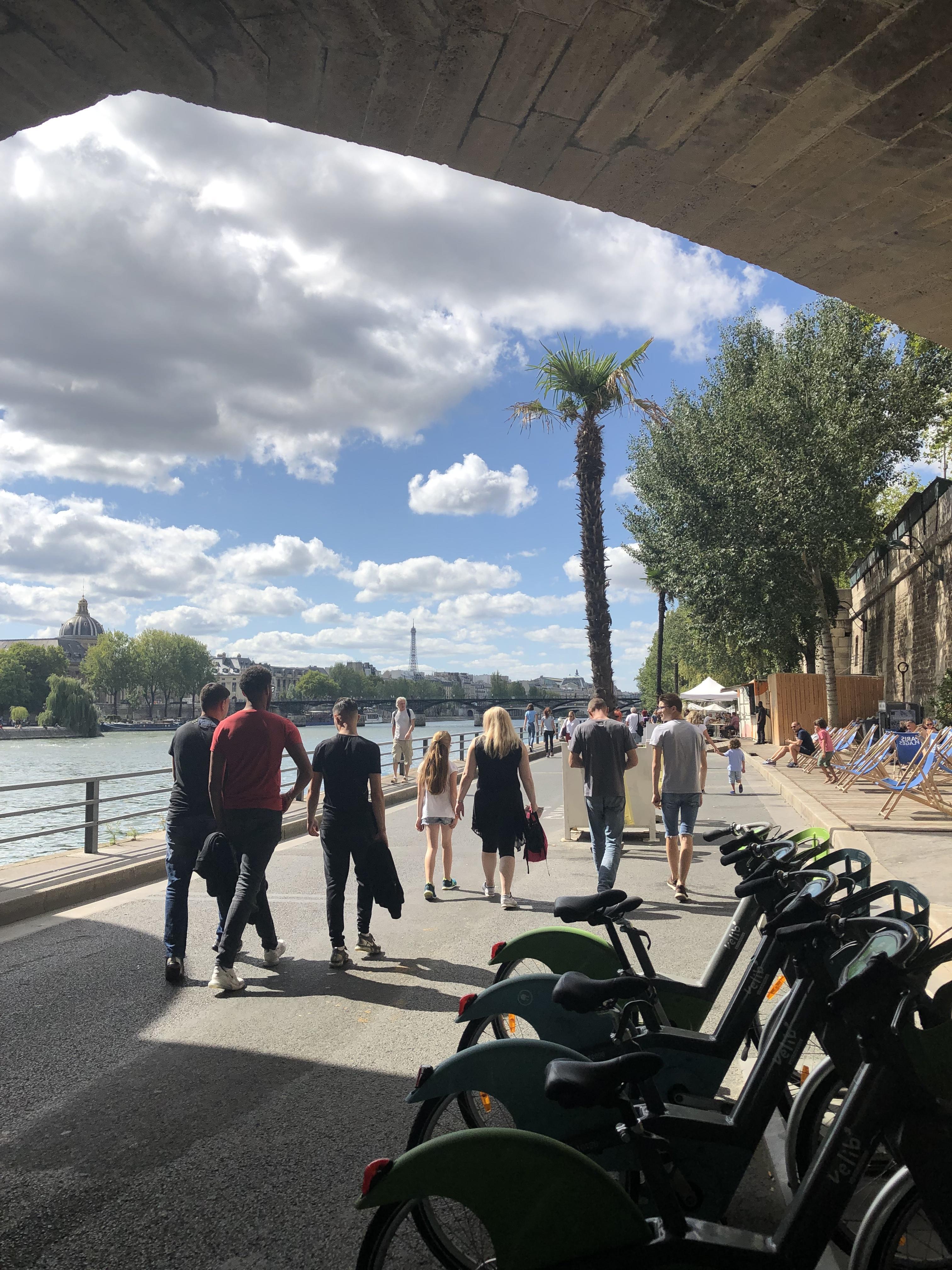 川沿いの道は車もいませんし、のんびり走ることができます。青空の下エッフェル塔に向かって走るのはとっても気持ちがよいです!