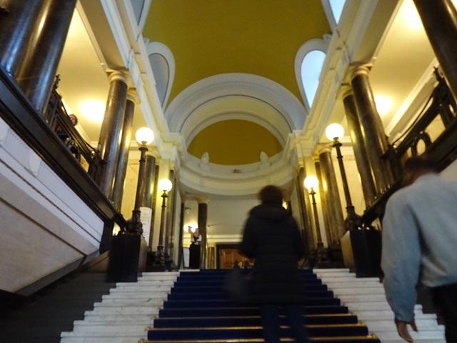 開場時刻となったら、この階段を上って劇場へ! 壁の所どころに昔の役職者名が刻んであったりして、さすが元お役所という面影を遺しているのが印象的です。