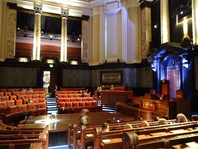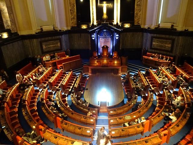 こちら↓が劇場の中です。元は議場として使われていた特徴を最大限に活かしたステージングと客席が、お見事! 中央舞台で繰り広げられる劇を観る我々も、裁判の傍聴人として出廷しているようにアレンジされていて緊迫感たっぷり。