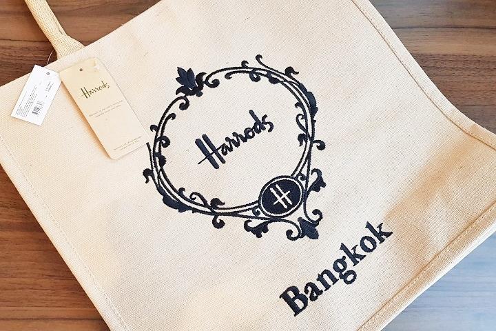 もうひとつ、私が気に入っているバンコク限定品の布バッグは、Harrods(ハロッズ)のトートバックです。今年購入時点で790B。こちらは、男性でも使いやすいのではないでしょうか。わりと大きなものもすっぽり入れることができます。取っ手の作りが若干弱い気もしないでもないですが、切れてしまったら、また自分で簡単に補修したり。カラフルな布等で覆って使い続けられるのも布バックならではの便利さではないでしょうか。