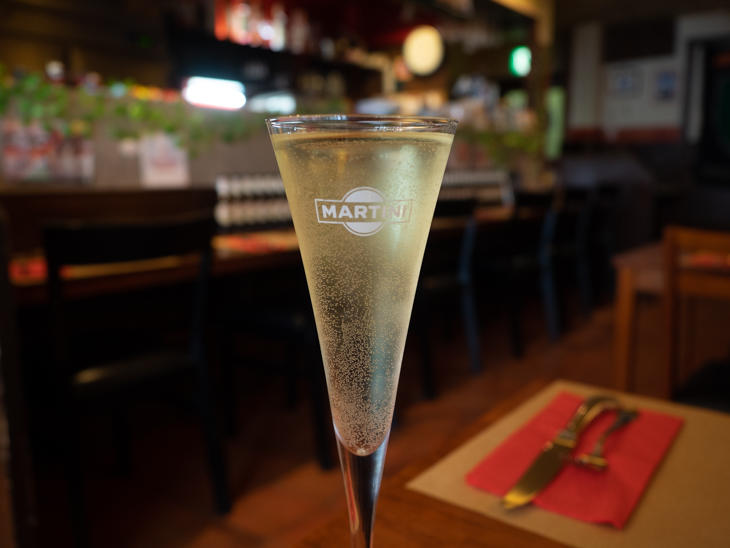 せっかくなので、ヨーロッパ的な情緒を一層楽しむべく、スパークリング「マルティーニ ブリュ」(グラス700円)で乾杯。