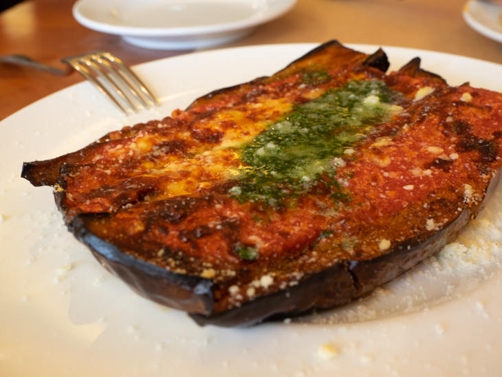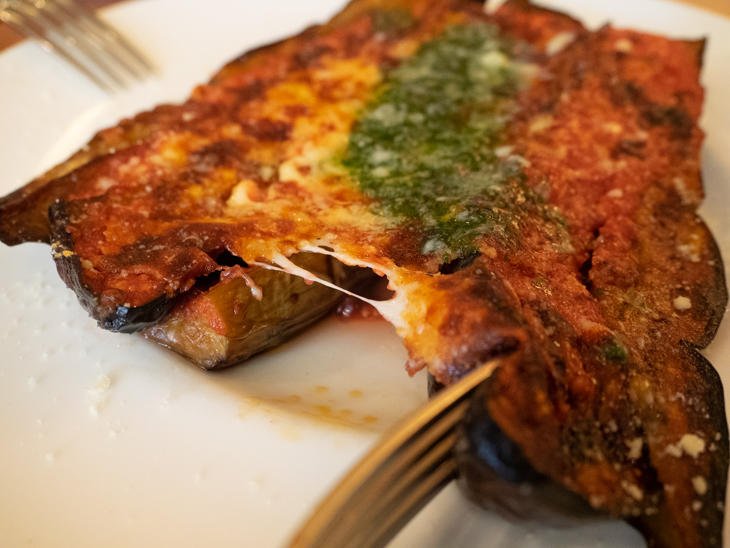 ジューシーな茄子は、ほどよくかかったチーズとバジルソースで。