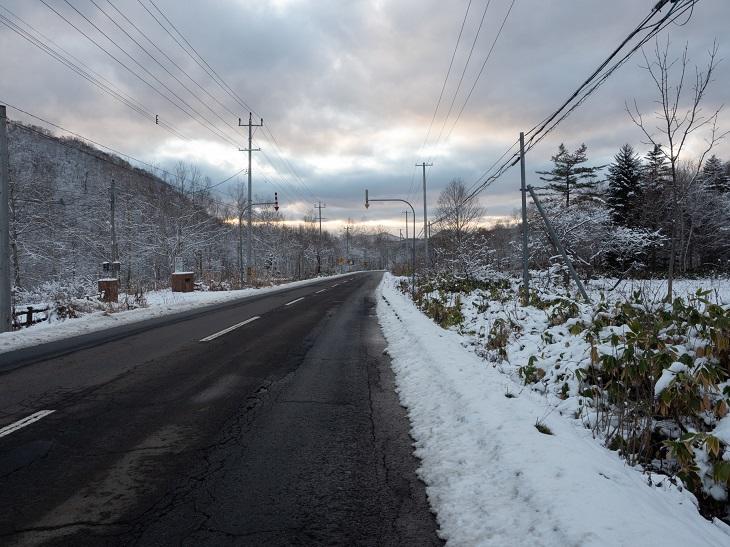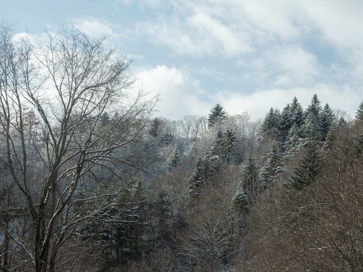 赤井川村から小樽へ続く山間では、道路には積もっていないものの、森はすっかり雪化粧。