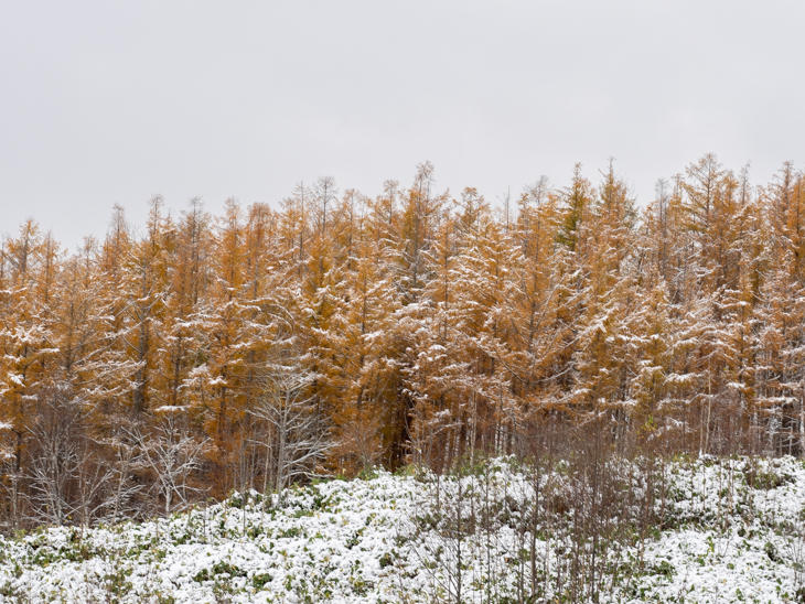 黄金色に黄葉しているカラマツにも雪が降り積もっていました。