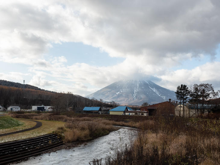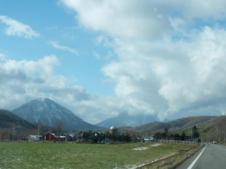 喜茂別町に入ると、尻別岳と頭が雲に隠れた羊蹄山が見えてきました。