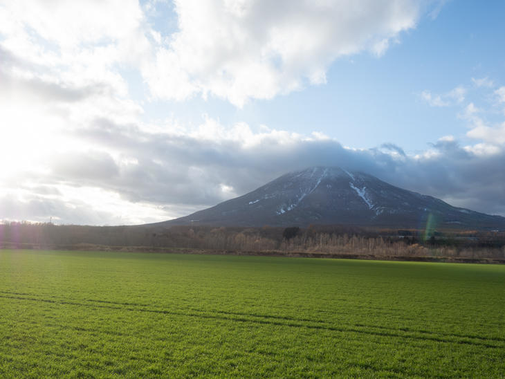喜茂別町から再び車を走らせていると、緑の畑の向こうに雪をうっすらと被った羊蹄山が大きく見えてきました。
