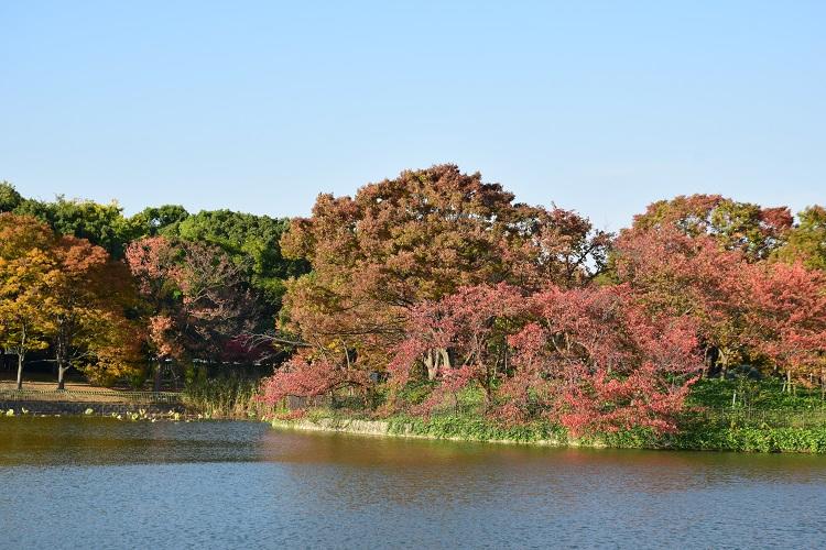 こんにちは。大阪特派員のかおりです。前回に引き続き、紅葉の見頃のお知らせです。大阪市内にある長居公園。競技場やサッカースタジアムのある大阪を代表する総合公園です。その中に大阪市立長居植物園があり、先日訪れたところ、紅葉が見頃に近づいていました。写真は2019年11月16日撮影です。大池の周りのケヤキ、カツラ、ハナミズキなどが色づいてきています。