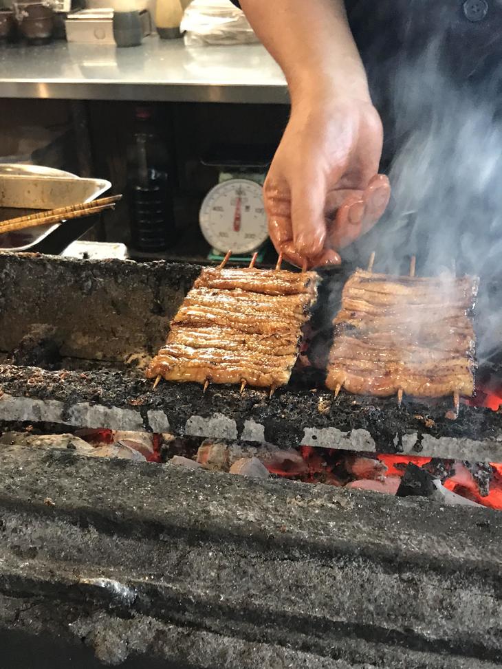 玄関を入るとすぐ焼き台があって、明るいおやじさんが出迎えてくれます。備長炭で焼く煙と美味しい鰻の香り! 熟練の手捌きで鰻を焼いている技! ずっと見ていたくなっちゃいます。でもお腹が空いているので中に入って席に着きます。