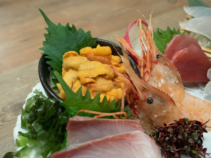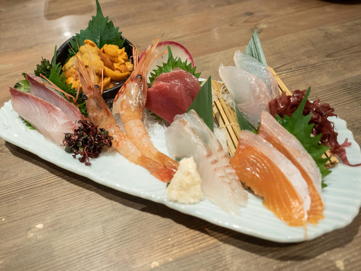 写真は「6種類2貫」(1,400円)と本日のおすすめにあった「ロシア産塩水生うに」(1,300円)で、6種類2貫の刺身盛は、2名でいろいろな料理をいただきたいときにもぴったりなひと皿です。
