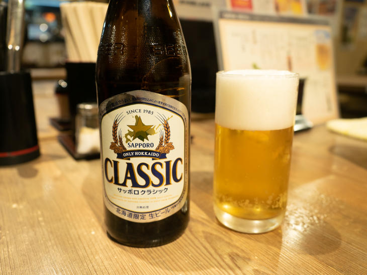 樽生はアサヒスーパードライですが、最初の一杯は、瓶ビールの「サッポロクラシック」(580円・税別/以下、価格表記は税別)で。
