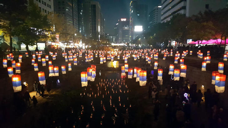 最近は17時を過ぎると暗くなるソウル。週末ということで、多くの人が清渓川のランタンの灯かりを楽しみに訪れていました。