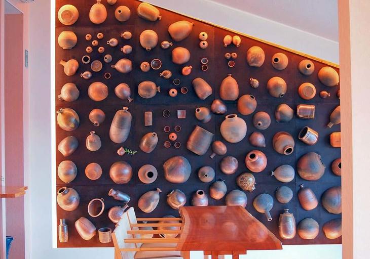 学芸員さんにカフェに案内していただき、壁のオブジェとなった備前焼で色々と教えていただきました。