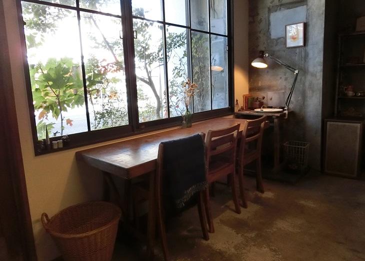 振り返ると、窓際のカウンター席からはエントランスの緑が揺れています。