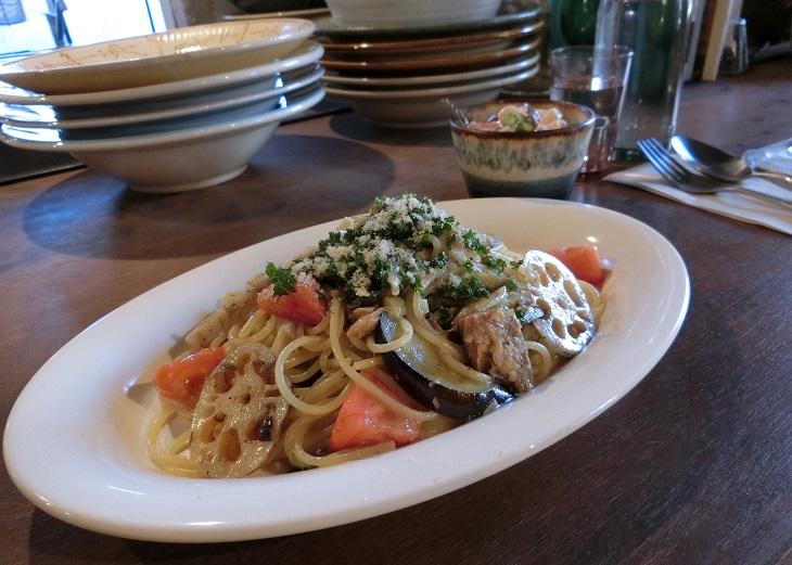 メニューは、「チキンカレー(1,100円)」ほか、季節のパスタなどもあります。上の写真は「サバと季節野菜のレモンバターパスタ(1,100円)」です。サバの旨みとすっきりレモンのコラボレーションがばっちりで、野菜もおいしくいただきました。
